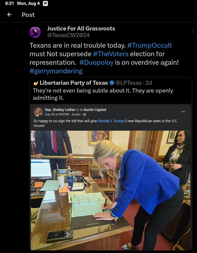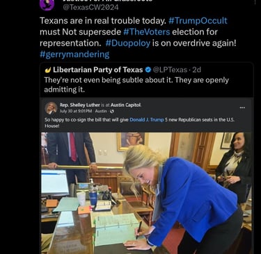 Texas is a sovereign state with a priority to serve the well-being of Texans. This gerrymandering move without substantial evidence voting districts should be redone is yet another example of #PoliticsOverPeople; and a crime committed against fair elections by both the Republicans and Democrat Parties in the past. Texans must rid themselves of the #Duopology that only favors political agenda and corporate greed.